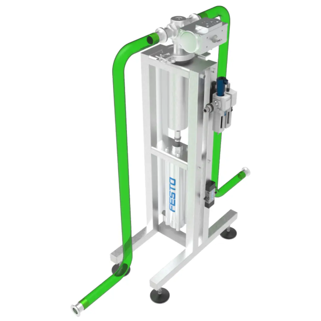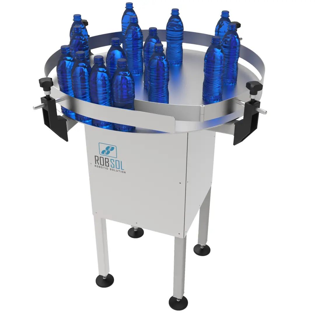 Mesa diseñada para acoplarse al sistema transportador de entrada o salida de máquinas envasadoras, bien sean propias o de terceros. Ideal para suministrar envases de forma constante y automática a las líneas de producción.