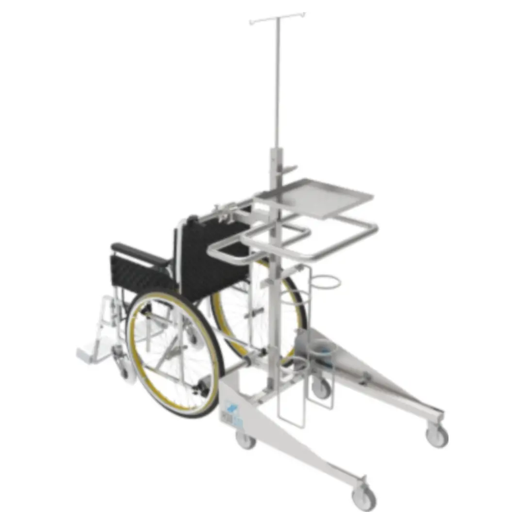 Equipo auxiliar para sillas de ruedas usada en el traslado de pacientes de UCI a exámenes médicos que cuentan con una sola persona de apoyo